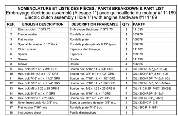 Requires the engine support 111177 for snowblowers 700580-4, 700582-4, and before.