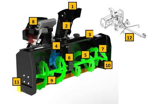 4. Impeller: High speed impeller (15″, 4 blades) propels snow to great distances. Protected by a shear bolt system.